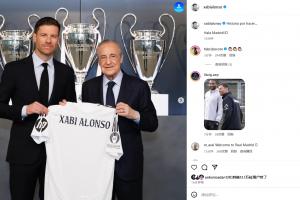 體育資訊5月27日訊 不久前,皇馬新帥哈維-阿隆索更新了社交媒體,曬出了自己與弗洛倫蒂諾手持皇馬球衣的合照。
