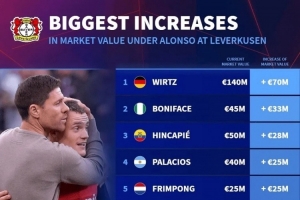 體育資訊5月27日訊 德國(guó)轉(zhuǎn)會(huì)市場(chǎng)統(tǒng)計(jì)了阿隆索執(zhí)教勒沃庫(kù)森期間,隊(duì)內(nèi)球員德轉(zhuǎn)身價(jià)的上漲金額,并列出榜單,維爾茨上漲7000萬(wàn)歐最多。