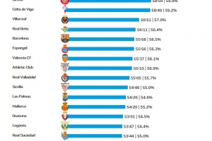體育資訊5月27日訊 本賽季西甲聯(lián)賽已經(jīng)落幕,數(shù)據(jù)平臺(tái)OPTA統(tǒng)計(jì)了本賽季西甲各隊(duì)的場(chǎng)均凈比賽時(shí)長(zhǎng),其中皇馬以59分40秒居首,馬競(jìng)59分25秒其次,巴薩55分58秒排在第7位。