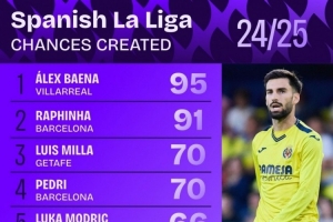 體育資訊5月28日訊 Squawka統(tǒng)計了球員本賽季在西甲創(chuàng)造機會的次數(shù),并列出榜單,巴埃納95次居首,拉菲尼亞91次第二。