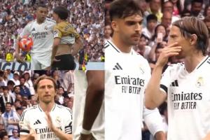 在進(jìn)球后,莫德里奇舉起雙手,開心慶祝。他之前對姆巴佩說道:基利安,射門(Kylian, tira)