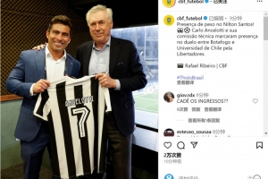 巴西新任主帥安切洛蒂及其教練團(tuán)隊(duì)來到里約奧林匹克體育場(chǎng),現(xiàn)場(chǎng)觀看博塔弗戈對(duì)陣智利大學(xué)的比賽,安切洛蒂獲贈(zèng)印有他名字的博塔弗戈7號(hào)球衣。