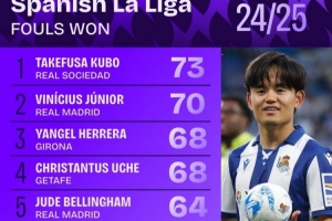 體育資訊5月28日訊 數(shù)據(jù)平臺(tái)Squawka今日公布了本賽季西甲聯(lián)賽被犯規(guī)次數(shù)榜,其中日本中場(chǎng)久保建英以73次被犯規(guī)居首,維尼修斯70次排名次席,貝林厄姆64次排在第5位。