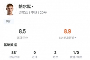 體育資訊5月29日訊 歐協(xié)聯(lián)決賽,切爾西4-1貝蒂斯奪冠。此役帕爾默首發(fā)出戰(zhàn)88分鐘發(fā)揮出色,球員全場重點(diǎn)數(shù)據(jù)如下↓