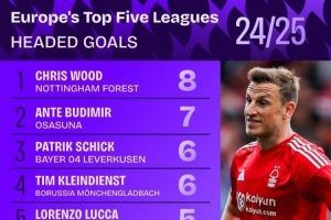 本賽季五大聯(lián)賽頭球進(jìn)球榜: