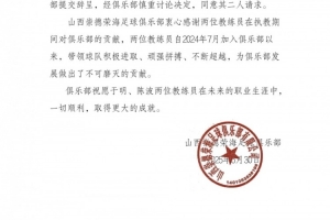 目前山西崇德榮以2勝5平4負(fù)的成績(jī)?cè)谥幸冶眳^(qū)排名第10。關(guān)于二人的辭職,山西崇德榮海俱樂部公告如下: