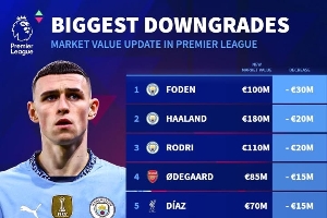 體育資訊05月31日訊 昨日英超更新身價,福登身價暴跌3000萬歐,是本期身價更新中跌幅最大的球員。