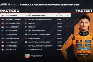 體育資訊5月31日訊 F1西班牙大獎賽一練結(jié)束,邁凱倫車手諾里斯全場最快,維斯塔潘P2,漢密爾頓P3。