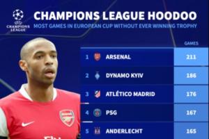 德轉統(tǒng)計參加歐冠比賽卻未奪冠的俱樂部中,阿森納211場仍未奪冠排名第一,而即將要沖擊首冠的巴黎,以167場仍未奪冠排名第4。