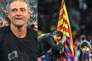 恩里克T恤上的卡通圖案是2015年巴薩奪得歐冠時,恩里克與女兒舉旗的名場面,只不過旗子換成了巴黎隊徽。