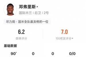 鄧弗里斯本場比賽數(shù)據(jù)如下: