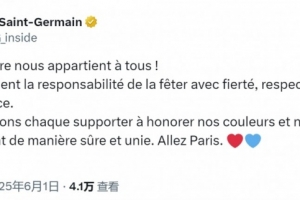 “隨之而來的是以自豪、尊重和友善的態(tài)度慶祝的責(zé)任。我們呼吁每一位球迷以安全和團(tuán)結(jié)的方式慶祝,彰顯我們的隊(duì)徽和價(jià)值觀。前進(jìn)巴黎!”