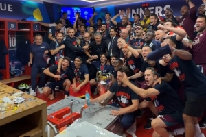 巴黎主帥恩里克賽后與球員們一起在更衣室內(nèi)慶祝奪冠并合影,巴黎官方社媒曬出視頻,配文:“我們是冠軍!”