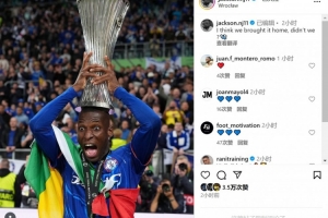 杰克遜社媒曬出頭頂歐協(xié)聯(lián)冠軍獎(jiǎng)杯的照片,并寫道:“我想我們把它帶回家了,不是嗎?”