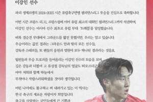 盡管本場比賽李剛仁沒出場,但他還是收獲了自己巴黎生涯的第7個冠軍獎杯,個人生涯已奪8冠。韓國足協(xié)官推今日曬出了該協(xié)會給李剛仁的賀信,內(nèi)容如下: