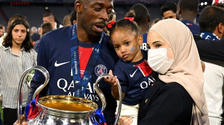 賽后,登貝萊與妻子女兒一起捧大耳朵杯慶祝。