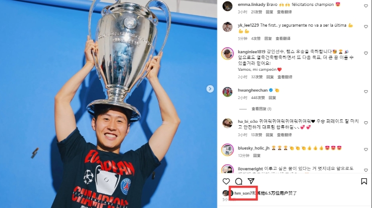 本賽季,熱刺奪得歐聯(lián)冠軍,此前孫興慜曬照慶祝時(shí)李剛?cè)室颤c(diǎn)了贊。