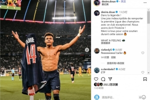 杜埃在社交媒體上曬出自己慶祝的照片,并寫道:“傳奇時刻!隨這家非凡的俱樂部贏得首座歐冠獎杯,喜悅之情無以言表。我們創(chuàng)造了歷史!
