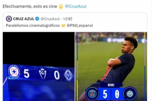 藍(lán)十字社媒曬出中北美冠軍杯決賽、歐冠決賽的比分,藍(lán)十字和巴黎都是5-0取勝,配文:“宛如電影的巧合?!?/p>