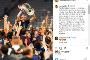 體育資訊6月2日訊 羅納爾迪尼奧更新社媒動(dòng)態(tài),祝賀恩里克帶領(lǐng)巴黎贏得歐冠冠軍。