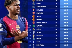 亞馬爾(巴薩)——1.8億歐(亞馬爾已拿過(guò)金童獎(jiǎng),不能再獲獎(jiǎng))