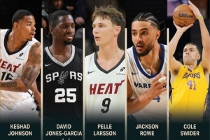 入選最佳陣容的5名球員分別是凱沙德-約翰遜(熱火)、大衛(wèi)-瓊斯-加西亞(馬刺)、佩萊-拉爾森(熱火)、杰克遜-羅(勇士)、科爾-斯威德(湖人)。5名球員里,佩萊-拉爾森是去年的44號(hào)秀,其他4人都是落選秀。