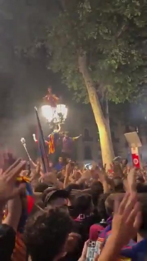 巴薩球迷們在球隊慶祝時,高喊梅西的名字。