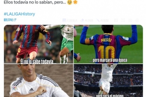 西甲官方曬出梅西的對(duì)比照,同時(shí)配文:“他還不知道,但他會(huì)在巴薩創(chuàng)造歷史”,而對(duì)于C羅的對(duì)比照,西甲官方配文:“他還不知道,但他會(huì)成為皇馬歷史最佳射手”。