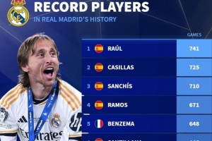 體育資訊7月10日訊 莫德里奇結(jié)束皇馬生涯,德國轉(zhuǎn)會市場列出了皇馬隊史出場榜,勞爾741場居首,莫德里奇597場排名第8位。
