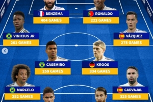 中場(chǎng):維尼修斯(261場(chǎng))、卡塞米羅(259場(chǎng))、克羅斯(334場(chǎng))、巴斯克斯(275場(chǎng))