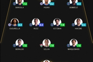 前鋒:巴爾科拉(巴黎,7.3分)、若昂-佩德羅(切爾西,8.2分)、登貝萊(巴黎,8.3分)