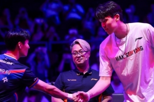 體育資訊7月11日訊 乒乓球WTT美國大滿貫男單1/8決賽,中國選手王楚欽對陣韓國選手李尚洙,楊瀚森來到現(xiàn)場為比賽挑邊。