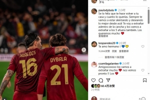 體育資訊7月12日訊 迪巴拉今天在Instagram發(fā)文,告別加盟博卡青年的羅馬隊友帕雷德斯。