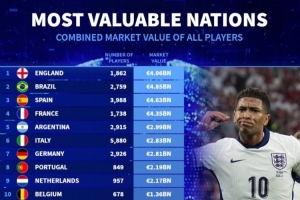 體育資訊7月12日訊 《轉(zhuǎn)會市場》統(tǒng)計(jì)了當(dāng)前各國球員的總身價情況,英格蘭、巴西、西班牙和法國位列第一集團(tuán)。