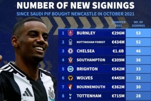 德轉(zhuǎn)列沙特入主紐卡后英超引援人數(shù)榜:身價(歐元)
