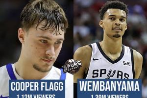 據(jù)數(shù)據(jù)統(tǒng)計(jì),本場弗拉格首秀觀眾人數(shù)最高達(dá)到112萬,但略低于2023年文班亞馬夏聯(lián)首秀的139萬。
