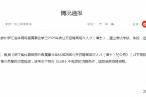 經(jīng)考察核實(shí),根據(jù)《浙江省體育局部分直屬事業(yè)單位2025年公開招聘高層次人才(博士)的公告》(以下簡稱《公告》)第二條第二點(diǎn)、第三條第四點(diǎn)等規(guī)定,該考生不符合《公告》中規(guī)定的招聘條件,現(xiàn)取消其招聘資格。