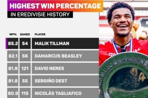 據(jù)統(tǒng)計,蒂爾曼是荷甲歷史上勝率最高的球員(出場至少50次),他在荷甲勝率為85.2%(46勝4平4負)。