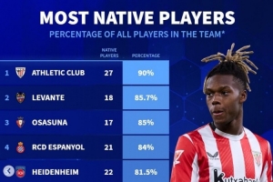 體育資訊7月13日訊 《轉(zhuǎn)會(huì)市場(chǎng)》統(tǒng)計(jì)了當(dāng)前五大聯(lián)賽一線隊(duì)本土球員占比情況,畢巴是唯一超過(guò)9成的球隊(duì)。