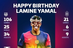 體育資訊7月13日訊 亞馬爾在今日正式迎來(lái)自己的18歲生日,而放眼世界足壇歷史也少有球員能在剛滿(mǎn)18歲時(shí)就能取得亞馬爾當(dāng)前的成就。