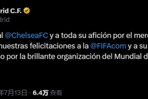 體育資訊7月14日訊 在切爾西3-0擊敗巴黎奪得世俱杯冠軍后,皇馬第一時間通過社交媒體表達了祝賀。