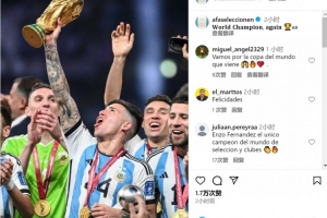 阿根廷隊官方社媒曬出恩佐2022年世界杯奪冠后舉起大力神杯的照片,配文:“再次贏得世界冠軍。”