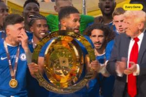 賽后頒獎儀式上,切爾西準(zhǔn)備捧杯之際,特朗普一直站在中間。切爾西球員桑切斯對其說了幾句話,因凡蒂諾也向其示意。