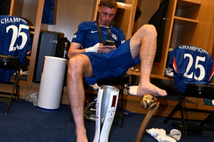 更衣室內(nèi),球員坐姿慵懶,腳踩世俱杯金球獎,胯下MVP獎杯,一如既往的“帕爾默風(fēng)格”。