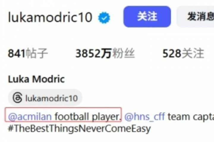 莫德里奇此前的個人簡介為皇馬球員,在加盟AC米蘭后,莫德里奇已經(jīng)將自己的社媒簡介改為了AC米蘭球員。