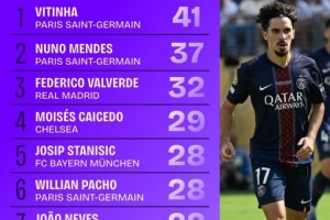 5、斯坦尼西奇(拜仁)、威廉-帕喬(巴黎)、若奧-內(nèi)維斯(巴黎)——28次