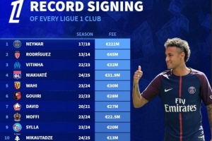 體育資訊7月15日訊 德國轉(zhuǎn)會(huì)市場(chǎng)統(tǒng)計(jì)了法甲各俱樂部的最貴引援,并列出榜單,巴黎2.22億歐簽下內(nèi)馬爾居首。