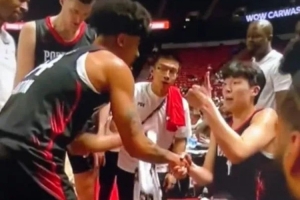 開拓者的夏季聯賽第一場,楊瀚森驚艷了全世界。不過在第三節(jié)節(jié)末,當楊瀚森張開雙手要球,隊友DJ-卡爾頓卻完全無視,在瘋狂運球之后高難度強投——皮球砸筐而出。