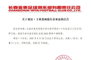 經(jīng)友好協(xié)商,長(zhǎng)春亞泰足球俱樂部與球員胡安·卡米洛簽訂工作合同。即日起,他將代表長(zhǎng)春亞泰隊(duì)征戰(zhàn)2025賽季中超聯(lián)賽。