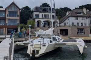 這艘價值2.5萬英鎊的三體賽艇在強風中被沖入百萬富翁大道北岸,四名船員安全脫險,但這艘名為Three Cheers的船體卡在了碼頭下方。